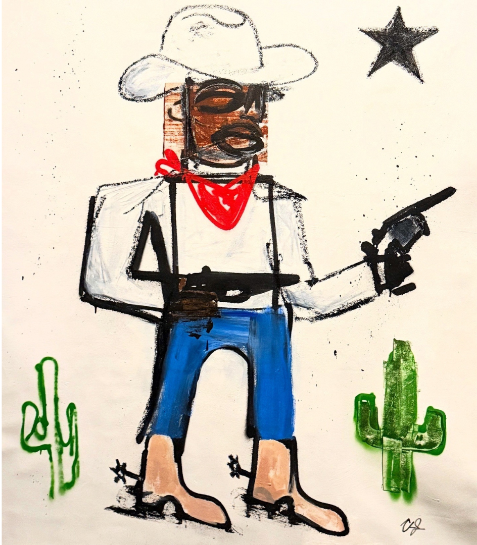 Layering spray paint, acrylics, oil pastels, graffiti mops into frenetic, mixed media, multi-perspective compositions, James paints in a raw, emotionally charged style that rejects formal constraints. His portraits—distorted yet human, spiritual yet grounded—evoke both the mask and the mirror, offering a glimpse into the human psyche shaped by society and survival.