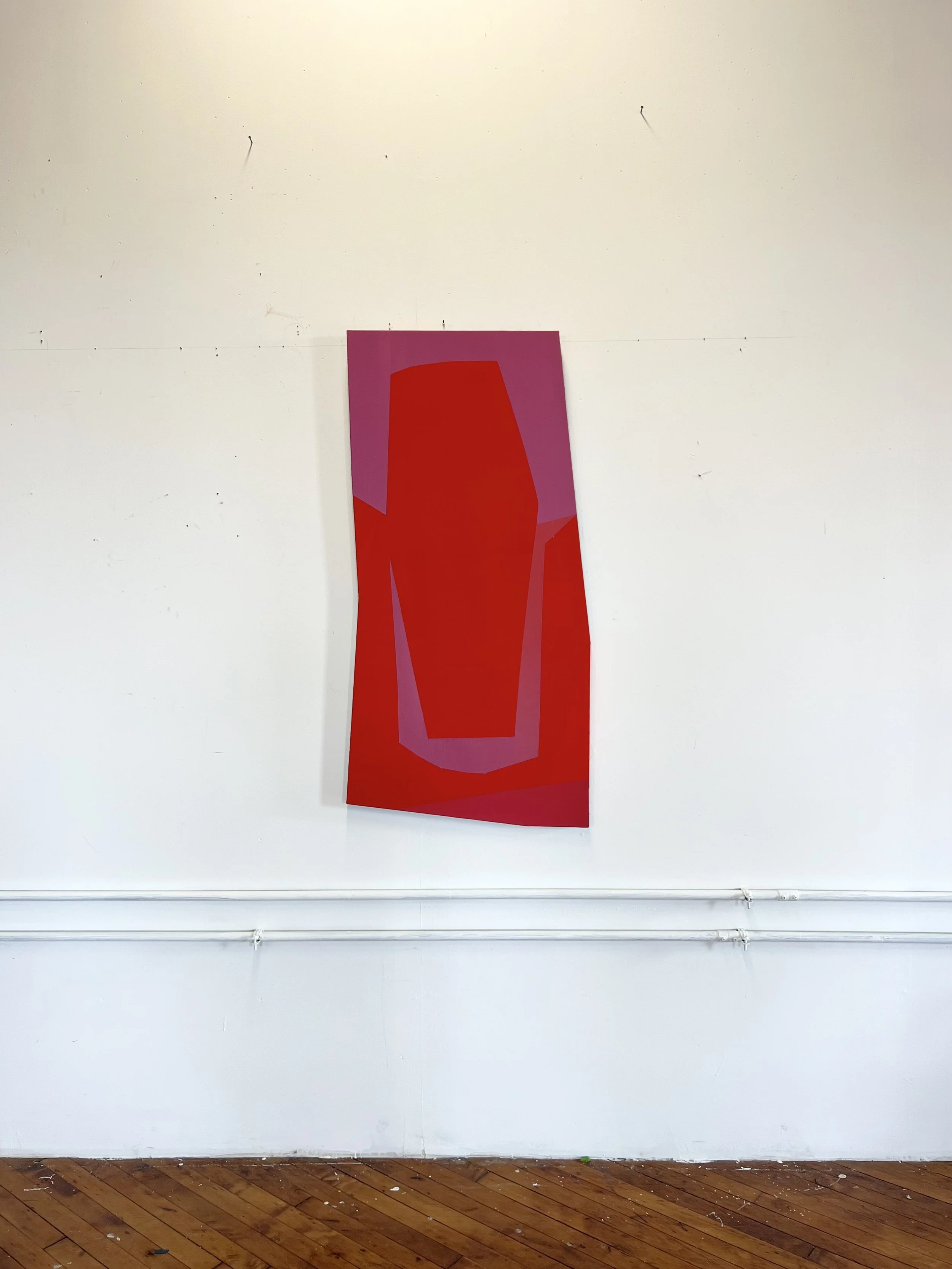 Emma Childs (b. 1996) is an American painter exploring color abstraction as a way of transforming intangible experiences and emotions into a language of layered acrylic paintings, often on shaped canvas. Childs’ work distills the complexities of human connection and emotional states using a minimalist presenting language of simplified form, color, and shape. Color is built up in layers on the canvas, with choices in color and application dancing between the intuitive and calculated. These shaped canvases are simultaneously images and sculptural objects, serving as containers built to give physical presence and structure to the intangible. Childs’ paintings offer layered depictions of the worlds we build around ourselves.